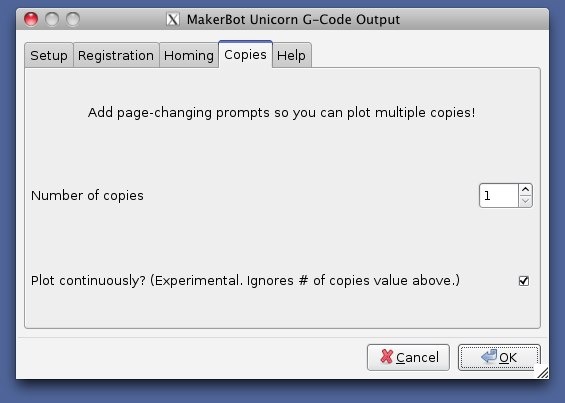 The the MakerBot Unicorn G-Code Output extension to Inkscape I've been working on so far for Thing-a-Day now has a new feature - support for copies and continuous plotting!