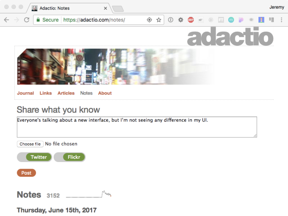 ★ Liked https://adactio.com/notes/12415 Jeremy Keith post from June 15, 2017 at 6:25PM UTC Everyone’s talking about a new interface, but I’m not seeing any difference in my UI. 🔗 June 15, 2017 at 4:48PM EDT • by Marty McGuire Have you posted a response to this? Let me know the URL: