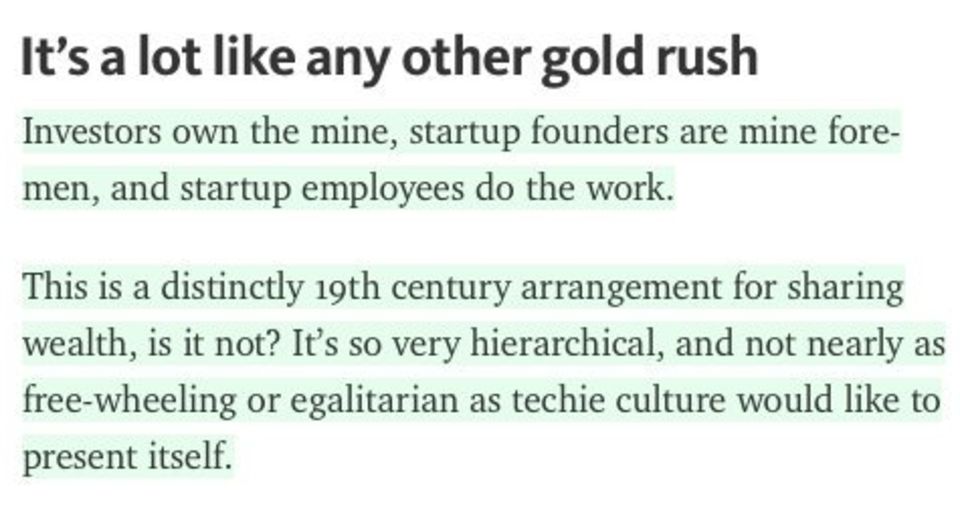 This is quite an interesting re-framing of accountability issues in tech companies. https://twitter.com/_danilo/status/880113154906312704 Spanish California post from June 28, 2017 at 10:18AM -0700 I've written to you before on how startup founders and execs act as mine foremen for their venture capital sponsors 🔗 June 28, 2017 at 1:50PM EDT • by Marty McGuire See also: Have you posted a response to this? Let me know the URL: Likes