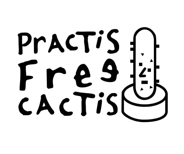 Next, apply the vinyl to the bottom of the frame. I used transfer tape for this and it was tedious and painstaking work! Take your time on this step!!Vinyl applied to the bottom of the screen, as seen through the top of the screen. This is how the design will appear on the finished work. Some duct tape is used to cover over the parts of the screen not covered by the vinyl. You can see the design says "Practis free cactis" alongside a cartoon potted cactus.