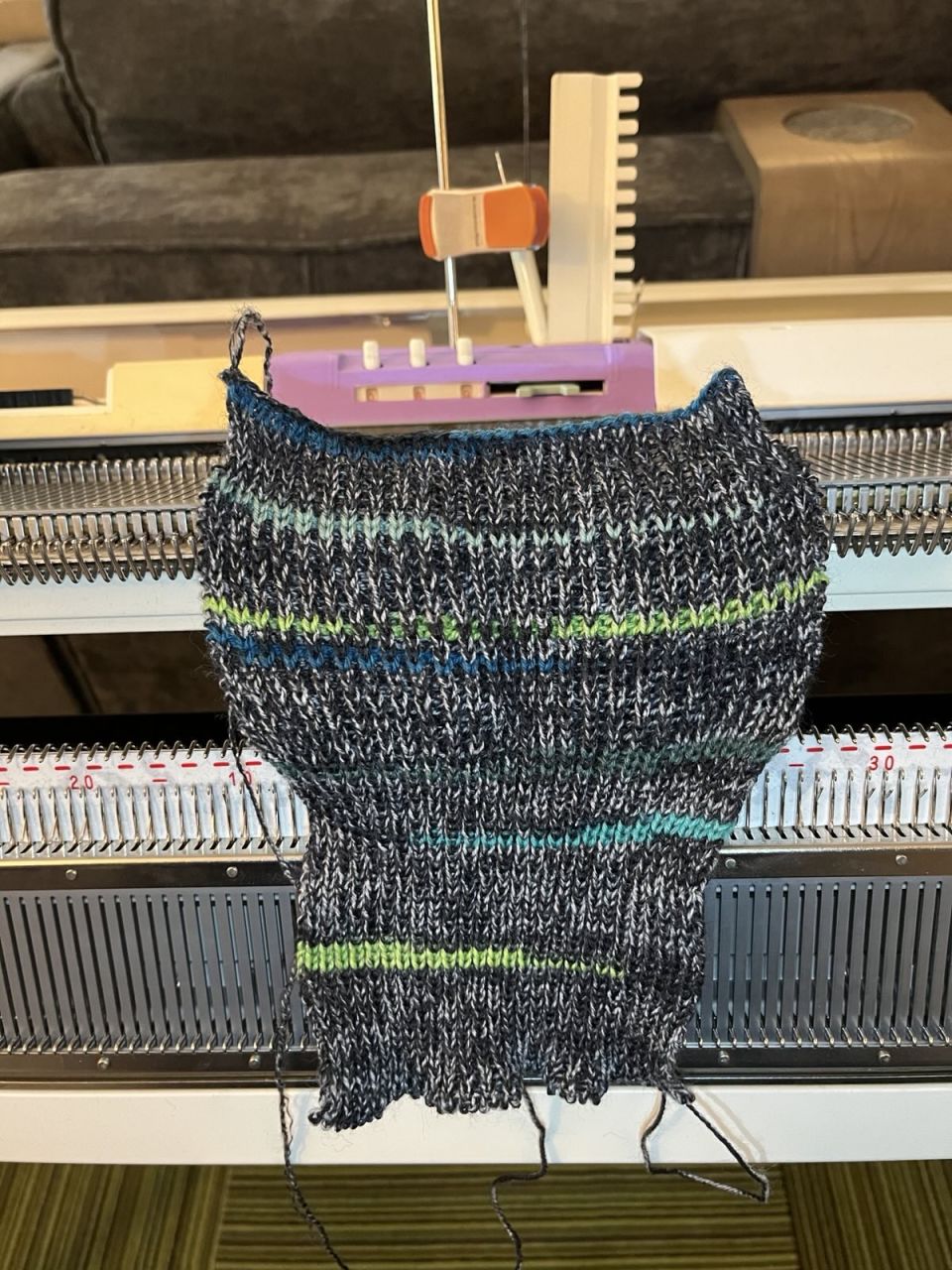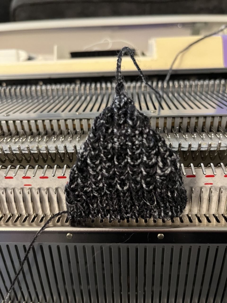 - I'd like to skip sewing up 1x1 rib edges for a bit. I think for a future hat I will start the ribbing on the machine, the graft the live stitches onto the hat body directly, which should leave me with a nice stretchy edge without testing my still-poor hand finishing skills.