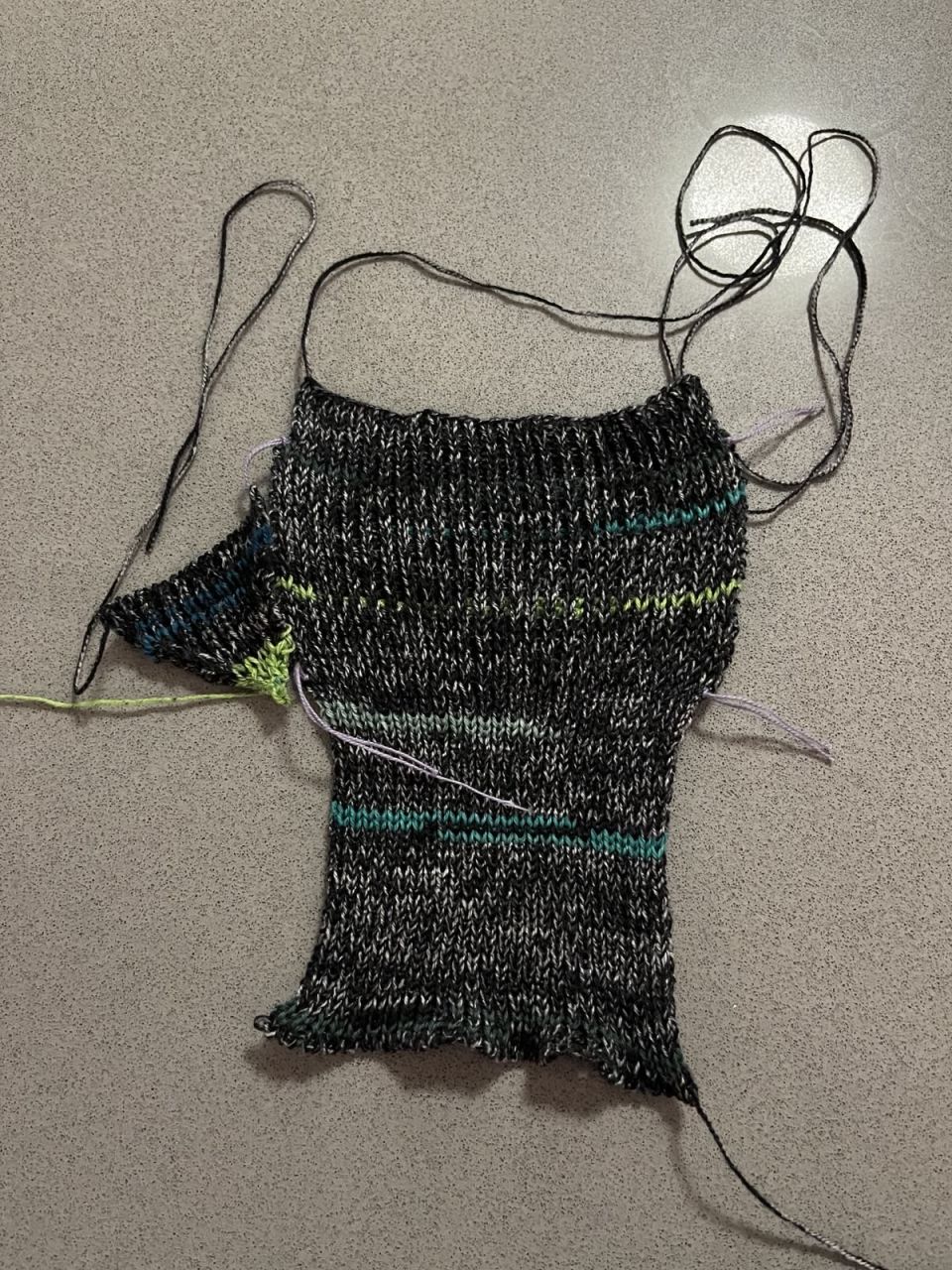- My math worked out so the body sections had an odd number of rows, which was pretty chaotic when it came time to bring held needles back into work. I think in the future I will either make sure that I round that row count up or down to the next even number for all sections, or perhaps alternate round-ups and round-downs to end up with the same number of rows.