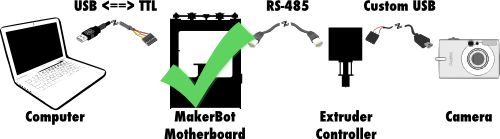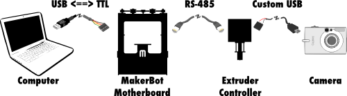 The MakerBot electronics ecosystem is comprised of 3 parts: your computer, the MakerBot's motherboard, and the extruder controller board. Your computer talks to the motherboard via a USB<->TTL interface (such as this FTDI cable from SparkFun). In turn, the motherboard communicates with the extruder using another serial protocol, RS-485, over an ethernet cable. Finally, the extruder triggers the camera via the custom cable I made in the previous post.The software for all three components is available on the indomitable GitHub. The software for your computer is called ReplicatorG, and the source can be found in the MakerBot ReplicatorG GitHub repository. I’ll talk more about ReplicatorG in the next post in this series. For now, we want to focus on the MakerBot G3Firmware GitHub repository, which contains the code for the motherboard (in the SanguinoMaster subdirectory), and for the extruder (in the ArduinoSlaveExtruder directory).