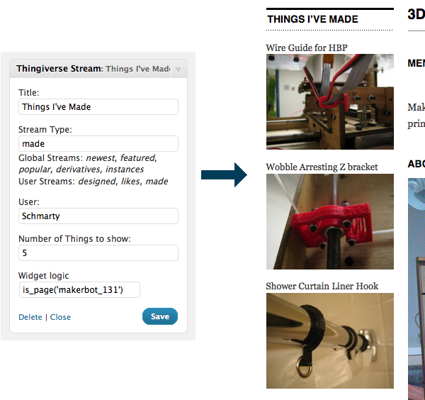 The plugin also includes a Thingiverse Stream widget, for embedding streams like “Things I’ve Made” as a simple sidebar widget. It just needs to be configured with the title, the type of stream you want to use, the Thingiverse username (for certain streams), and the maximum number of Things to display.