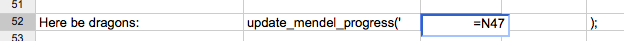 Here, column N47 contains the "completeness" of the Mendel as a value of 0.0 - 1.0 in terms of number of hours printed so far divided by the expected number of hours total. This data could be used on an HTML page with an "update_mendel_progress" function by loading it with a script tag: